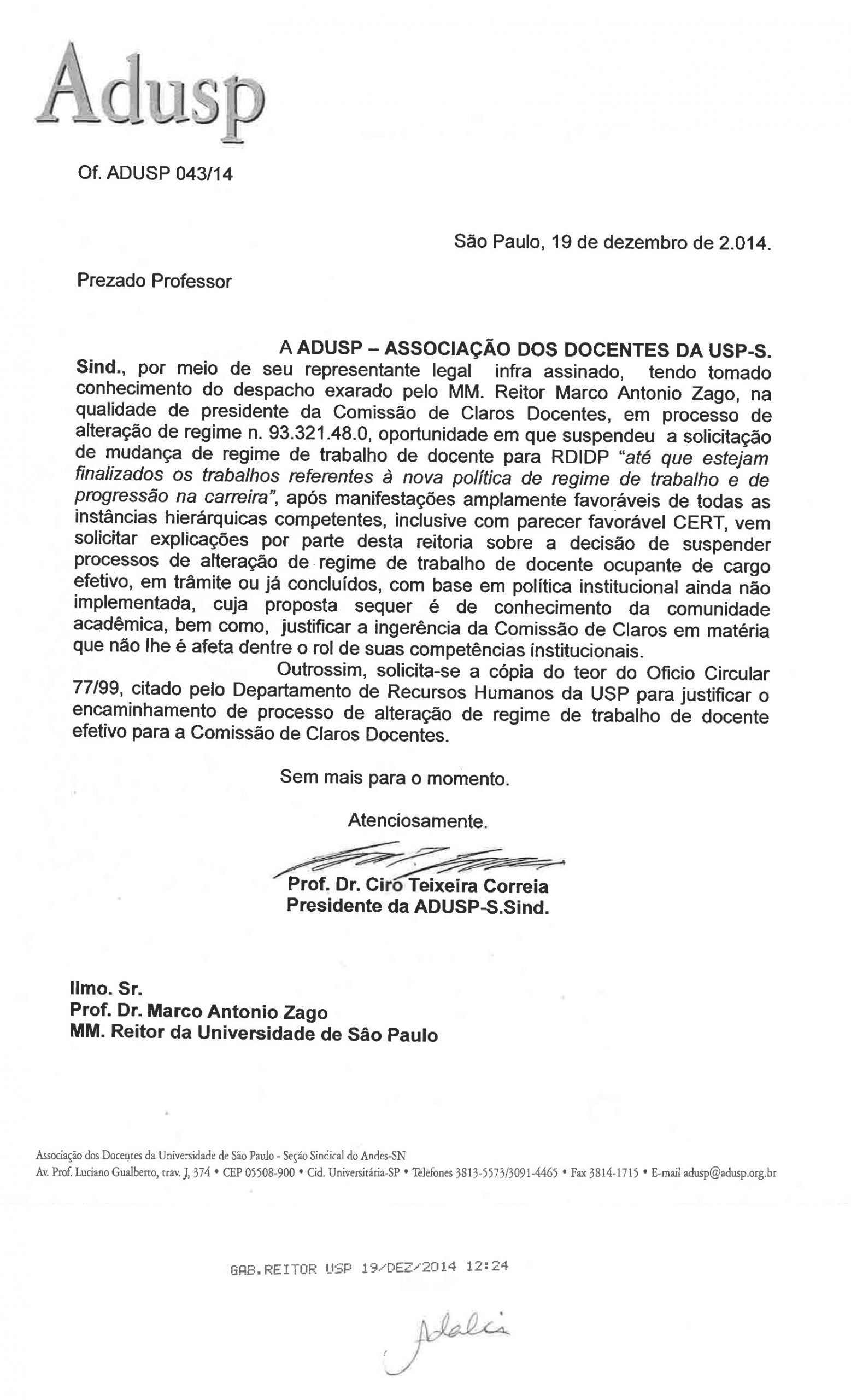 A Adusp tomou conhecimento do despacho exarado pelo reitor M.A. Zago, na qualidade de presidente da Comissão de Claros Docentes, em processo de alteração de regime 93.321.48.0, oportunidade em que suspendeu a solicitação de mudança de regime de trabalho de uma docente para RDIDP “até que estejam finalizados os trabalhos referentes à nova política de regime de trabalho e de progressão na carreira”.