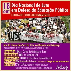 Em São Paulo (capital), a manifestação ocorre a partir das 17h, com concentração no vão do MASP, na Avenida Paulista. O ponto de encontro da Adusp é no Conjunto Nacional, esquina com Padre João Manoel. Em Ribeirão Preto, será na Esplanada do Teatro D. Pedro II, às 11h30; em São Carlos, após concentração às 9h no Palquinho do CAASO na Praça XV de Novembro, a marcha seguirá da USP para o Mercadão; em Piracicaba ocorrerá às 14 h no Centro de Vivências da Esalq; em Pirassununga será às 18 h, no portão da FZEA.