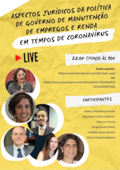 “Aspectos Jurídicos da Política de Governo de Manutenção de Emprego e Renda” é o nome da conversa transmitida ao vivo pela Internet — live, como se convencionou chamar — que reunirá, na próxima terça-feira, 28/4, às 10 horas, um grupo de juristas e pesquisadores que atuam na área do Direito do Trabalho, entre os quais o desembargador Jorge Souto Maior, do Tribunal Regional do Trabalho (TRT-2) e o juiz Marcus Orione, ambos professores da Faculdade de Direito (FD) da USP, e a desembargadora Sayonara Grillo Coutinho Leonardo da Silva (TRT-1).