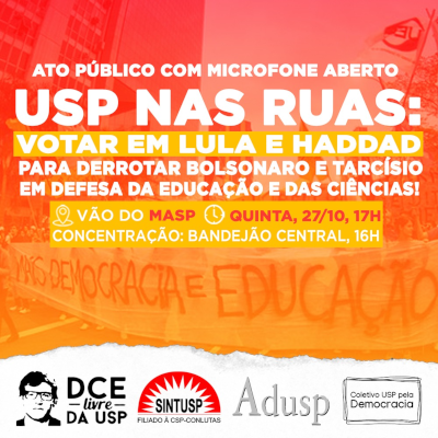 Nesta quinta-feira (27/10), o ato USP nas Ruas – Votar em Lula e Haddad para Derrotar Bolsonaro e Tarcísio em Defesa da Educação e das Ciências terá concentração no Bandejão Central da Cidade Universitária às 16h, caminhada até a Estação Butantã do Metrô e deslocamento para o vão do Masp, na avenida Paulista.