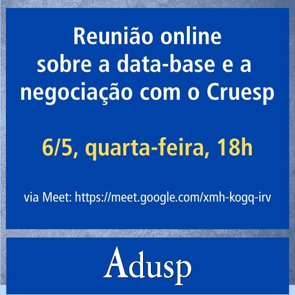 Na mesma semana da reunião agendada com o Cruesp, a Adusp promoverá duas atividades relacionadas à campanha da data-base. A primeira delas será no dia 6 de maio, quarta-feira, às 18h, quando será realizada uma reunião online com a categoria sobre a negociação em andamento com as reitorias. A conversa servirá para colher contribuições e esclarecer eventuais dúvidas.