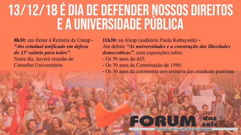 Logo após a realização de uma manifestação em frente à Reitoria da Unesp, nesta quinta-feira, 13/12, em prol do pagamento do 13º salário para todos, o Fórum das Seis promoverá um importante ato/debate na Assembleia Legislativa (Alesp). A atividade, intitulada “As universidades e a construção das liberdades democráticas”, tem o apoio do mandato do deputado Carlos Giannazi e ocorrerá às 11h30, no auditório Paulo Kobayashi.