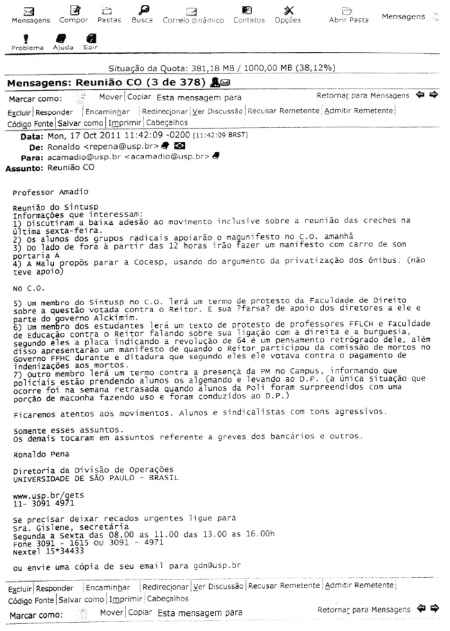 Em outras palavras, o chefe de gabinete não sentiu necessidade de repreender o diretor da DOV por este lhe repassar “informações que interessam” sobre o Sintusp, nem por lhe informar sobre manifestações que iriam ocorrer na reunião seguinte do Conselho Universitário (Co), nem mesmo por lhe afirmar, em claro desvio de função: “Ficaremos atentos aos movimentos”. Por que será?