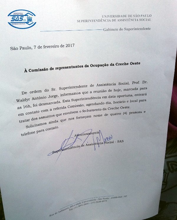 horário e local para tratar os assuntos que envolvem o fechamento da Creche Oeste". Porém, diferentemente da informação que consta no documento, a ordem de cancelamento da reunião na verdade teria partido da Reitoria, segundo informações do funcionário que recebeu a Comissão.
