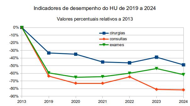 Tomamos o ano de 2013 (0% no gráfico) como referência para comparação, pois desde pelo menos 2009, no geral, é o que apresentou números maiores de atendimentos dos indicadores de desempenho considerados, sendo que em publicação anterior (já citada) é possível verificar tais indicadores em anos anteriores. No período 2019-2024 em comparação com 2013 o número de cirurgias realizadas a cada ano foi diminuindo, com ligeiro aumento em 2023, mas posteriormente retornando em queda, e neste mesmo período as consultas médicas foram decrescendo, subindo um pouco em 2022, mas voltando a cair a partir de então e os exames complementares sofreram queda, embora tenham apresentado um crescimento de 2020 a 2023, mas descrescendo a partir de então.