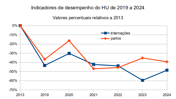 Em comparação com 2013 (0% no gráfico), o número referente às internações diminuiu, chegando a uma defasagem de mais de 40% em relação àquele de 2019, tendo ligeiro acréscimo até 2020 e depois voltando a diminuir até 2023, quando volta a subir em 2024, mas atingindo apenas cerca da metade do desempenho de 2013. O número de partos diminui até 2019, depois sobe até 2020, quando houve deslocamento dos atendimentos de obstetrícia do Hospital das Clínicas para o HU por causa da pandemia de Covid-19, voltando a cair até 2021 e a partir daí subindo novamente até 2023, com pequena diminuição até 2024. De novo, é muito evidente o contraste entre o atendimento nesses dois quesitos em 2013 e sua diminuição numérica até 2024, o que demanda uma explicação sobre o ocorrido, pois não é razoável supor que se trate apenas de uma “fotografia” que expressa as contingências do período ao qual as comunidades da USP e do SUS-Butantã estão submetidas; é bem mais plausível que resulte de condições às quais o HU tem sido sujeitado por sucessivas gestões da Reitoria da USP.