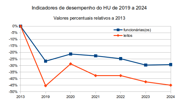 Vejamos, a seguir, os principais dados de desempenho do HU no período citado, que permitem verificar, por exemplo, a perda de pessoal e a diminuição de leitos, ambas notáveis e propositais, que propiciaram e ainda propiciam uma inacreditável queda no atendimento à comunidade USP e à comunidade SUS-Butantã no período 2013-2024.
