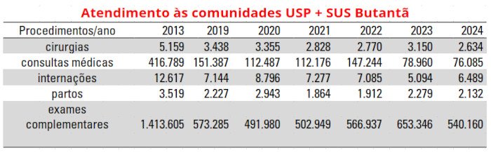E, ainda, já tenha sido capaz de realizar um atendimento à comunidade SUS-Butantã de: 1) 4.179 cirurgias em 2013 e tenha realizado apenas 2.337 em 2024?; 2) 280.399 consultas médicas em 2011 e tão somente 32.173 em 2024?; 3) 1.045.989 exames complementares em 2013 e 431.578 em 2024?; e 4) 11.635 internações em 2013 e apenas 6.253 em 2024?