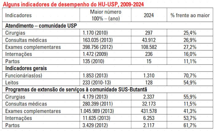 Como explicar que o hospital já tenha sido capaz de realizar um atendimento à comunidade USP de 1) 1.170 cirurgias em 2010 e tenha realizado apenas 297 em 2024?; 2) 163.035 consultas médicas em 2013 e tão somente 43.912 em 2024?; 3) 398.756 exames complementares em 2012 e 108.582 em 2024?; e 4) 1.472 internações em 2009 e apenas 236 em 2024?