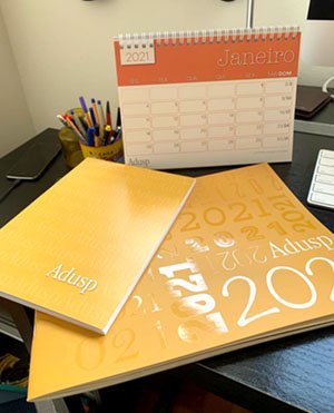 A Adusp já recebeu da gráfica os brindes de Ano Novo que serão distribuídos entre o(a)s docentes filiado(a)s. Além do caderno organizador, sempre muito procurado, desta vez o kit inclui o calendário de mesa 2021 e um bloco de notas. O material será enviado pelos Correios para o endereço residencial que consta do cadastro da Adusp.